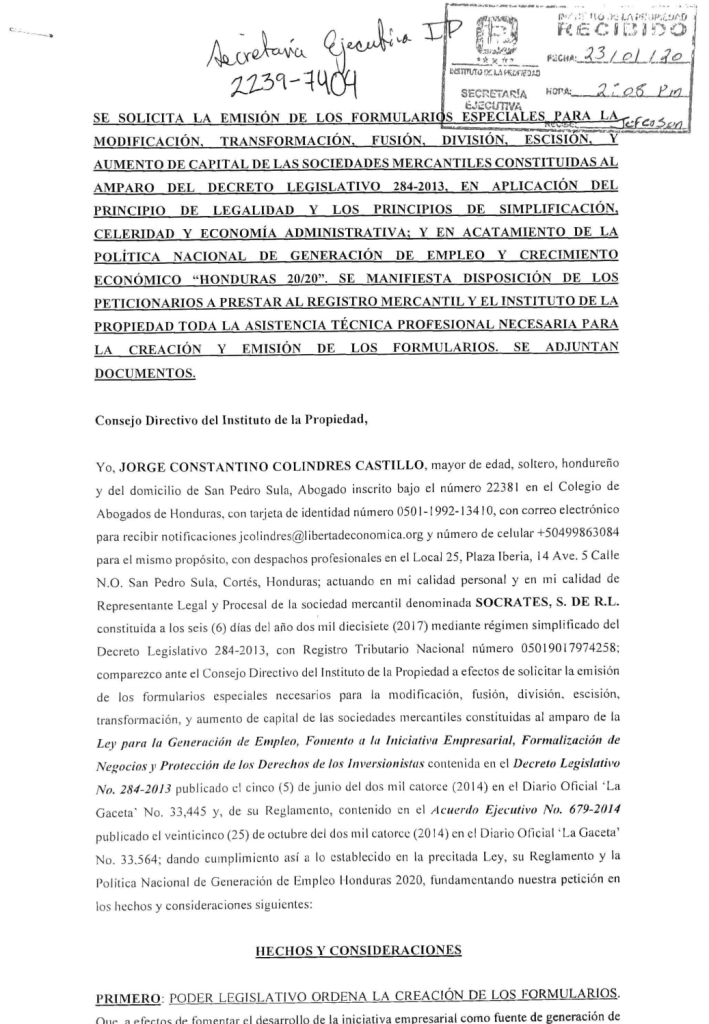 En enero del presente año, el equipo de FLE presentó una solicitud al Consejo Directivo del Instituto de la Propiedad para que, después de 7 años de letargo administrativo, proceda a emitir los formularios especiales que ordena el Decreto Legislativo No. 284-2013 y que eliminan la necesidad de acudir a un Notario Público para realizar reformas, fusiones y aumentos de capital en las sociedades mercantiles.